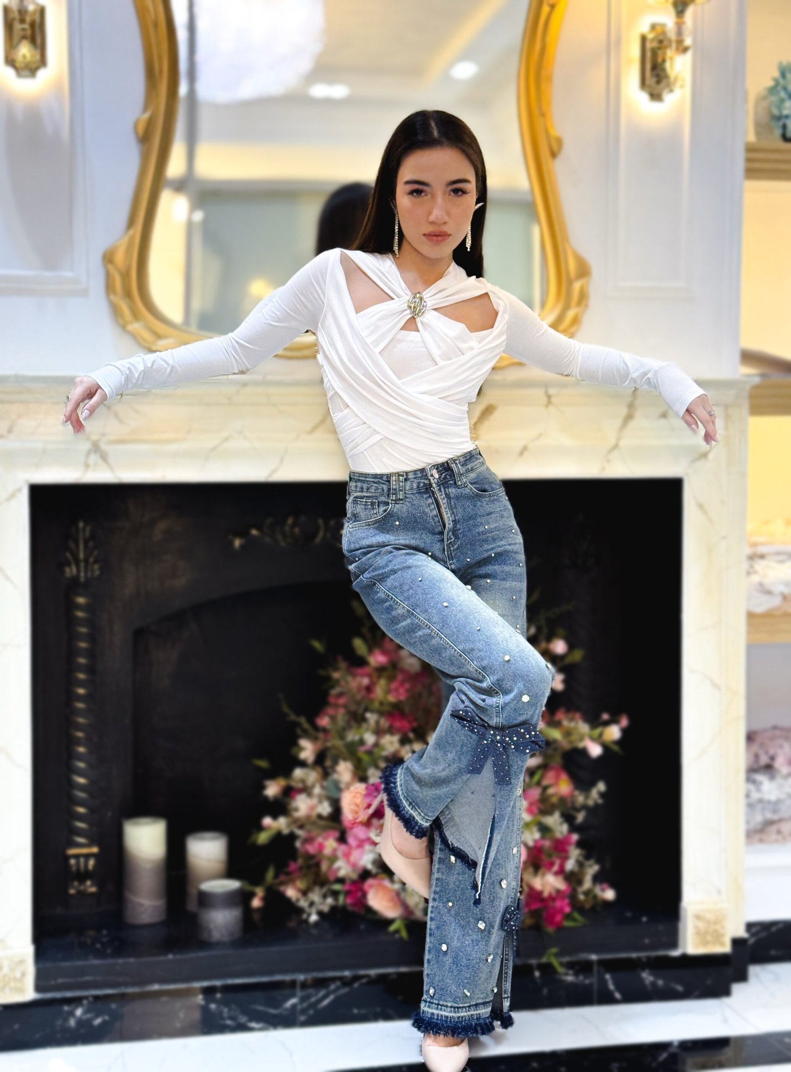 Crafted with meticulous care, these pants feature intricate crystal embellishments that sparkle with every step. The embellishments are strategically positioned to add a touch of glamour without overwhelming the neutral base of denim. Additionally, the durable craftsmanship ensures that this wardrobe essential maintains its polished look, even after repeated wear. Upgrade your wardrobe with a piece that speaks to your unique sense of style. These Crystal Embellished Wide-Leg Denim Pants promise an iconic blend of comfort, functionality, and undeniable elegance, making them your next statement piece. Whether paired with heels and a structured blazer or with sneakers and a casual top, these pants adapt effortlessly to your styling preferences.