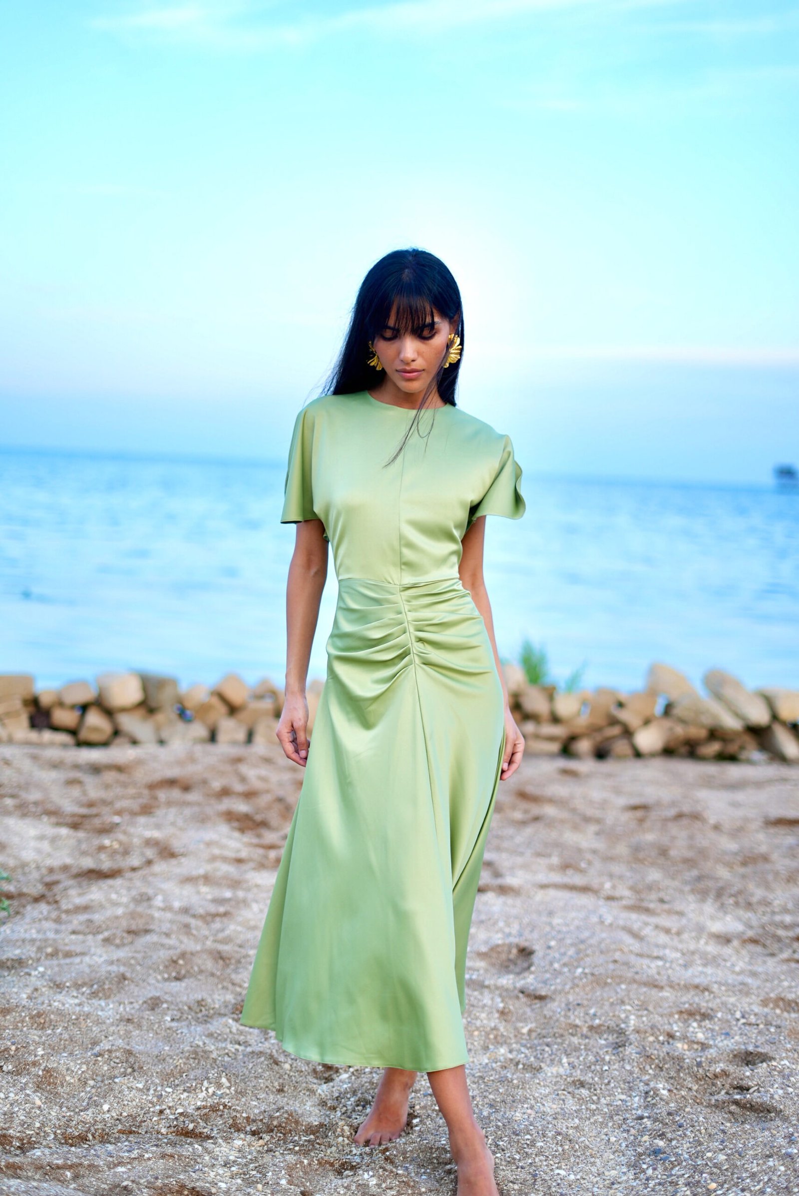 Satin Midi Dress with Ruched Waist