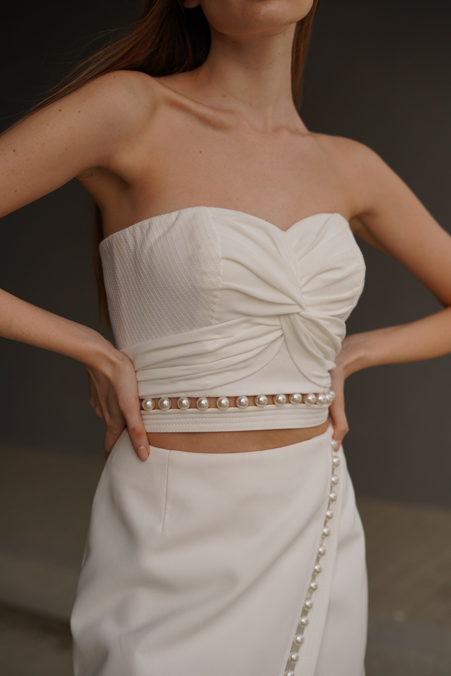 White Strapless Crop Top with Knot Detail and Pearl Trim